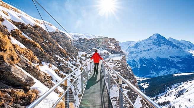 If you’re not a skier, there’s plenty of snow fun beyond the pistes, with ski schools offering a flurry of activities from the quietly exhilarating (snowshoeing through silent, frosty forests) to the downright intrepid (ice climbing and ski diving from a height of 4,300m in front of Eiger’s north face).